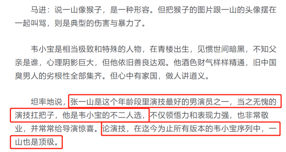 除此以外,马进还谈到了网上对张一山的恶评。对于张一山夸张式的表演,马进却极力称赞张一山演技好,甚至直言他是当之无愧的演技扛把子,也是韦小宝的不贰人选。不但和同年龄段男演员作比较,甚至导演还用张一山和其他版本的韦小宝作比较,认为他即使和周星驰、梁朝伟、陈小春、张卫健等人相比,张一山也是顶级的。