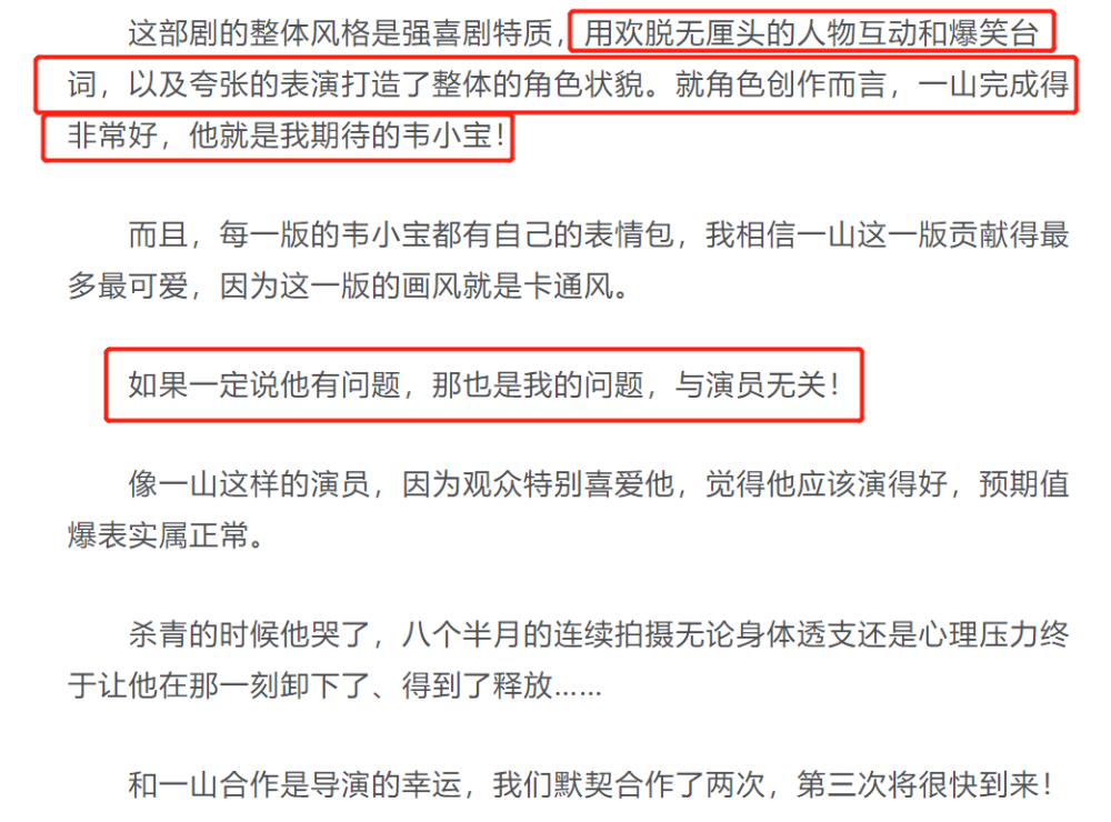 同时导演也再次强调,张一山版本的《韦小宝》风格是强喜剧特质,想要用无厘头的人物互动和爆笑台词,以及夸张的表演,来塑造角色。因此马进又一次称赞张一山演得好,就是自己期待的韦小宝,甚至还自动背锅,称如果说张一山有问题,那也是自己的问题,和演员无关。