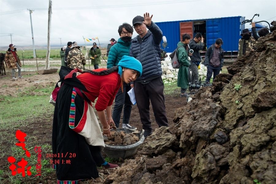 导演万玛才旦与演员们在片场。