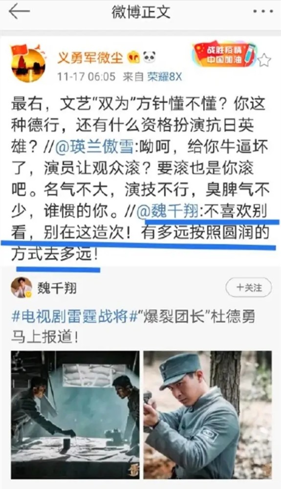 公然与网友为敌,自然不会有好果子吃!于是,魏千翔的这条微博下,成了双方互撕的战场,而所有声音几乎是一边倒地站在网友一方。有人直接怼他:“文艺的双为方针你懂不懂?就你这种德行,还有什么资格扮演抗日英雄?”