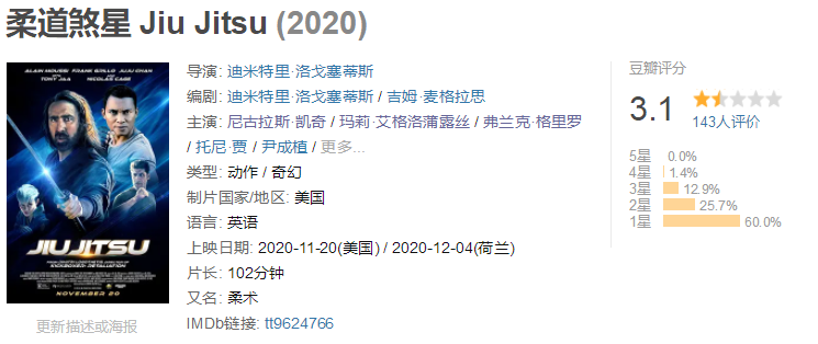 在豆瓣平台,《柔道煞星》仅拿到3.1分,一星差评就高达60%,五星好评为零。