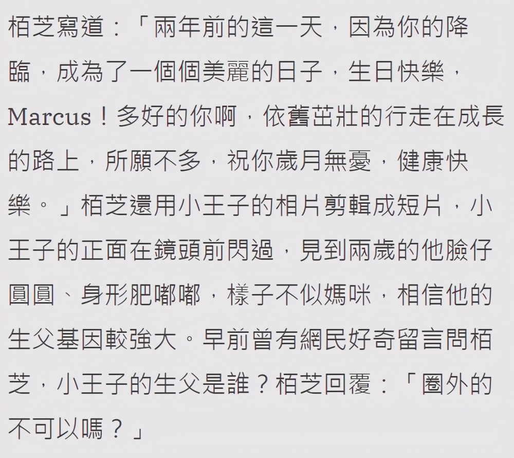 港媒在小王子两岁生日之际,还替张柏芝辟谣,他们采用张柏芝此前对网友的回复,证实孩子生父并非圈中人。