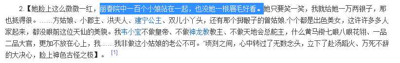 小说中,韦小宝更是对她一见如故,认为“丽春院中一百个小娘站在一路,也没她一根眉毛好看。”