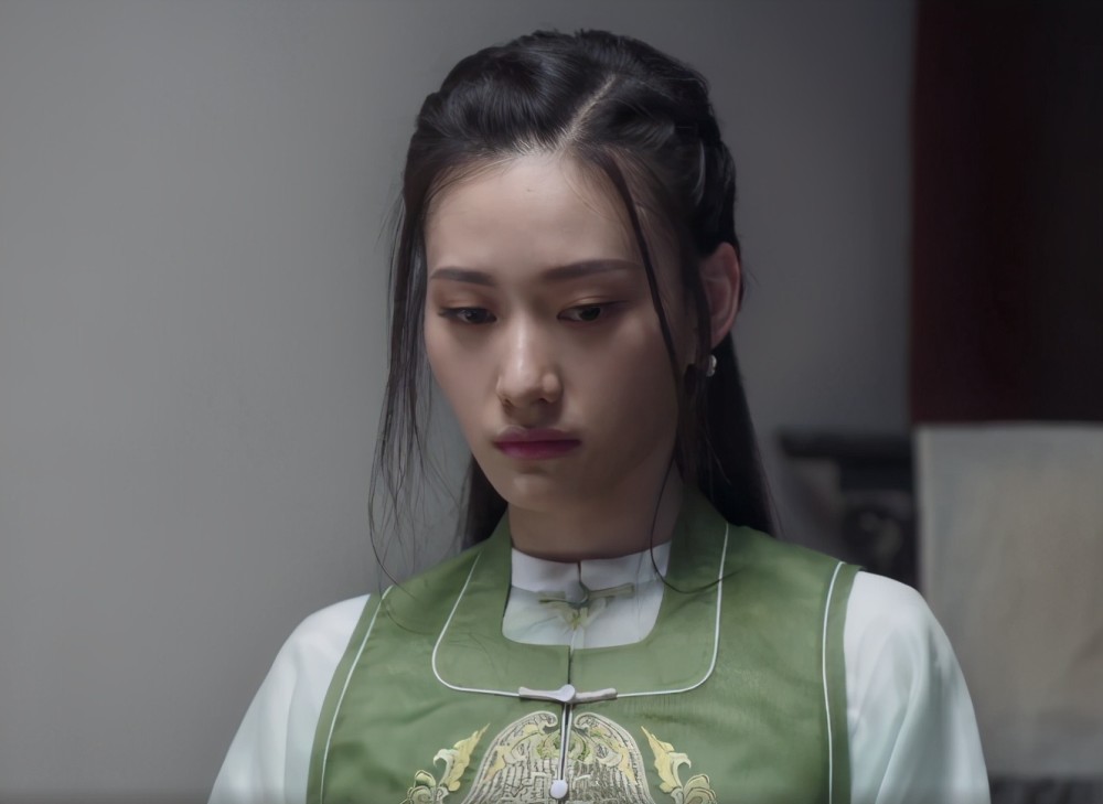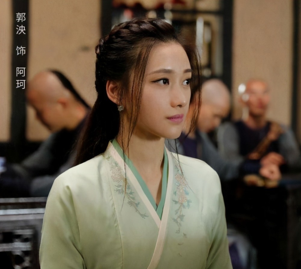 当剧里的“阿珂”换下尼姑装,穿上寻常的古装,她依然是一字眉,也依然涂着“死亡芭比粉”,再一看,新换上的一副还是绿的,这种搭配真的是又难看又土气。