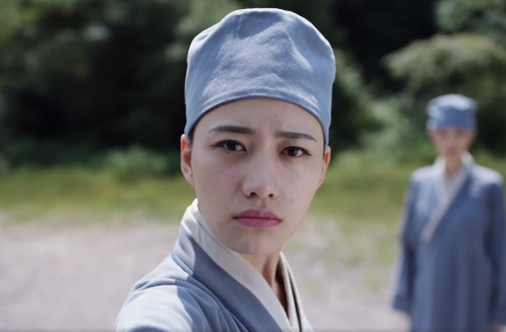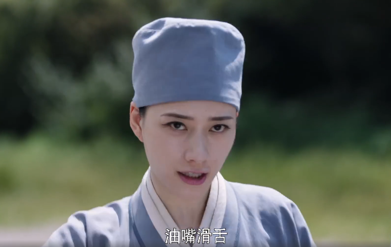走近一看,阿珂画着饱受诟病却依旧不改的一字眉,搭配细长的眼线,以及明显没擦好润唇膏就匆匆涂上的“芭比粉唇”,既不见原小说中阿珂的娇媚,也不像个尼姑,倒是看出来一些英气。
