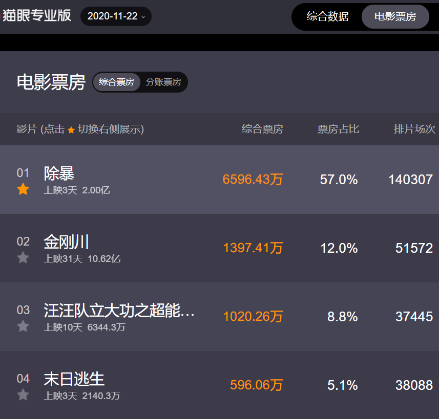 根据最近几天的票房数据可以看出,从11月20日吴彦祖《除暴》上映以后,吴京 张译 的《金刚川》就被挤下冠军宝座,而《除暴》开画以后票房表现生猛,仅仅3天时间就拿到了2个亿的票房,平均单日6000万以上,毫不夸张地说,整个11月份,除了《金刚川》以外,票房表现最好的一部电影,就是《除暴》。