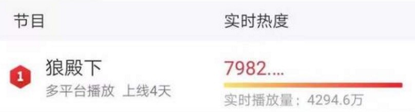 另外《狼殿下》开播的方式是毫无宣传的情况之下多台同时上线,所以说这一瞬间起来的热度已经是与《鹿鼎记》成了极强的反差效应,所以大家关注《狼殿下》不再看《鹿鼎记》也是出于一种人群讨论的效应吧。