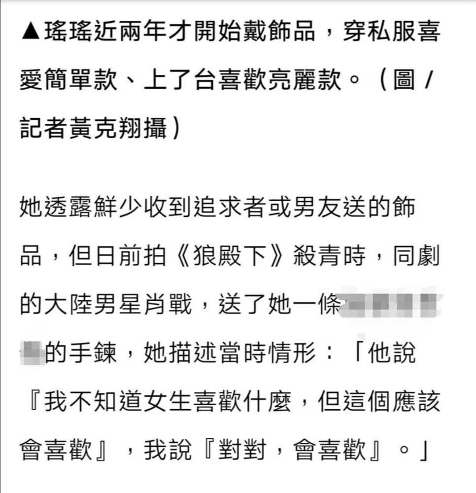 《狼殿下》饰演宝娜公主的郭书瑶 曾透露,她鲜少收到追求者或男友送的饰品,但是《狼殿下》杀青时,肖战送给了她一条手链。郭书瑶还回忆了当时的情形,肖战说不知道女生喜欢什么,但这个应该会喜欢。
