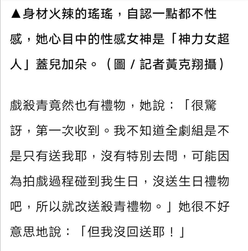 事后面对记者的采访,郭书瑶回应了,没想到自己杀青也有礼物,当时很惊讶,因为是第一次收到。用郭书瑶的话来说就是“我不知道全剧组是否是只有送我耶,没有特别去问,可能因为拍戏过程碰到我生日,没送生日礼物吧,所以就改送杀青礼物。”
