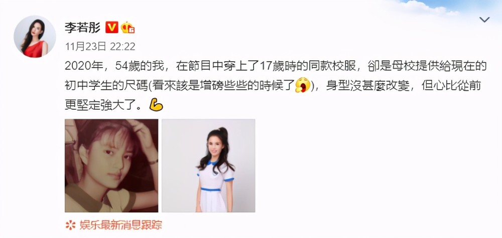李若彤在文案中再次提及自己年龄:2020年,54岁的我,在节目中穿上17岁时的同款校服,却是母校提供给现在的初中学生的尺码(看来该是增磅些些的时候了),身型没甚么改变,但心比从前更坚定强大了。