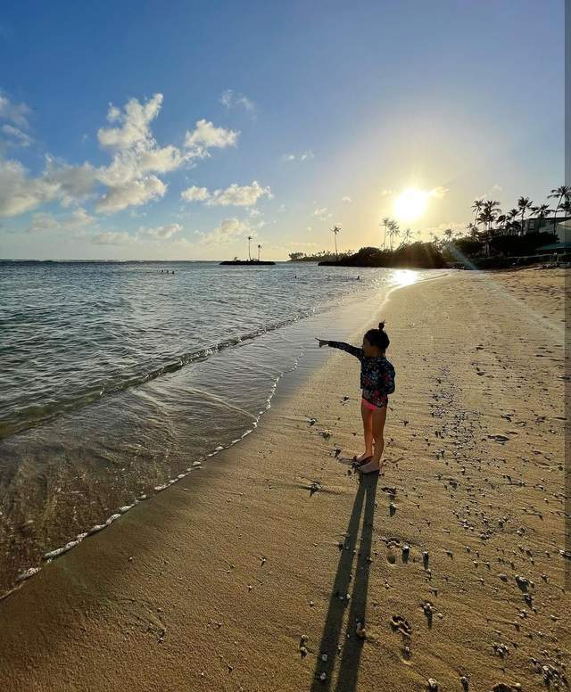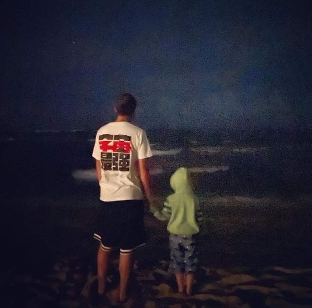 夜里,父女俩还一路在海边手牵着手,Alaia迅速蹿高,已经长高到爸爸的腰以上位置。