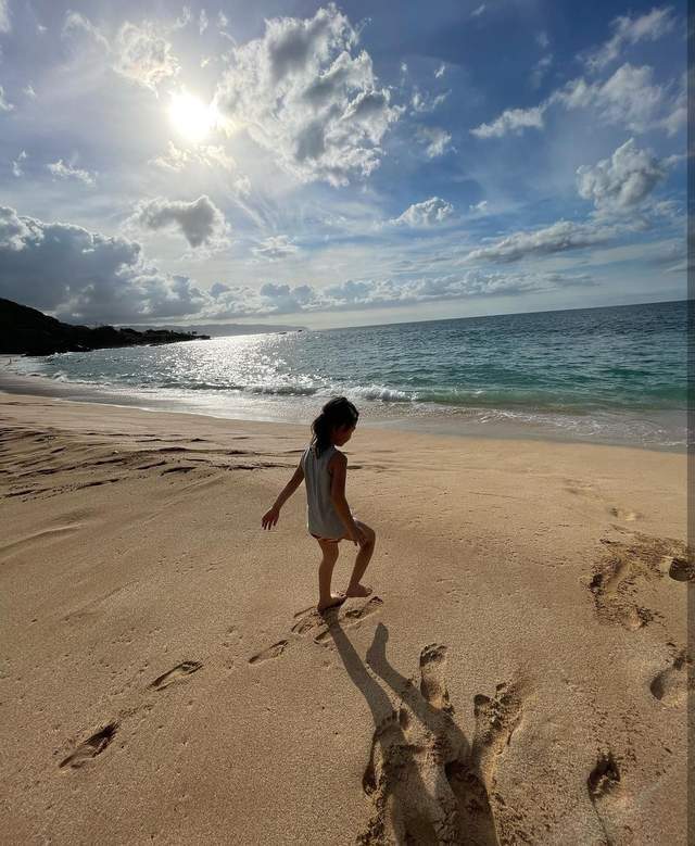Alaia在沙滩上留下一串小脚印,陈冠希又不由得定格这纯真美好的画面。天上的云层非常低,很梦幻。