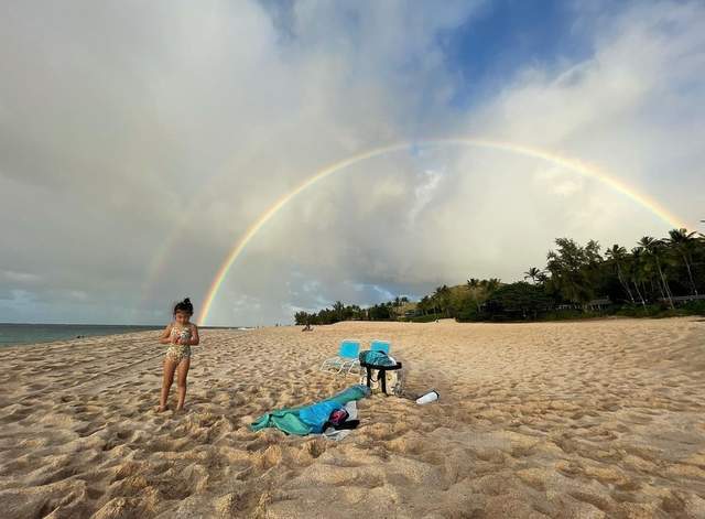 前一天,陈冠希还分享了女儿穿着泳衣站在沙滩上的萌态,扎着丸子头,软软糯糯,宽广的沙滩上几乎没有什么游客,Alaia的身后出现了双彩虹,十分有意境。
