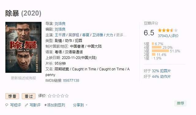 看到这段剧情先容,估计不少观众会说,这个故事和演员配备没毛病啊,不是爆款的标配么?上王千源搭档吴彦祖,糊的概率很低啊。然而,目前《除暴》在豆瓣,将近3.8万人打分,评分6.5分,俨然严重低于预期,已经糊了。