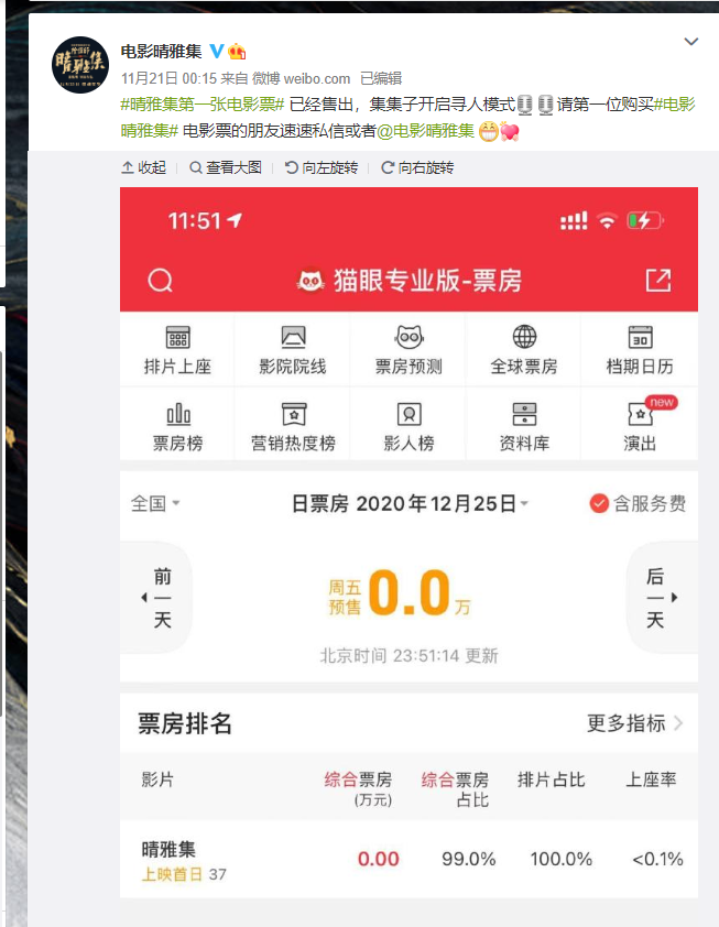 11月21日,对于电影《晴雅集》来说,是一个特别值得纪念的日子,因为在那一天第一张电影票已经售出,提前一个多月预售,从这一天就开始统计了,关于票房与数据,关于荣耀与梦想,对郭敬明导演来说,对邓伦、赵又廷这些优秀的演员来说,考验已经开始!