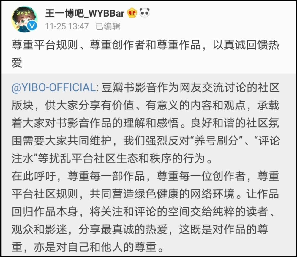 王一博方就粉丝“养号”发声,呼吁粉丝遵守规则