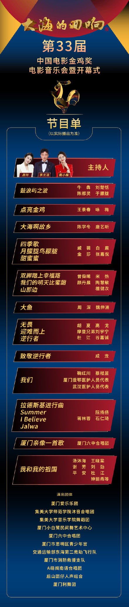 今晚(11月25日)8点,第33届中国电影金鸡奖颁奖盛典系列活动开幕式将在福建厦门进行。官方也在今天午时发布了开幕式节目单,陈学冬和唐艺昕合唱《大海啊故乡》、周深和魏伸洲合唱《大鱼》、成龙演唱《致敬逆行者》,另外,还有一些乐团、合唱团的节目。嘉宾阵容豪华,节目内容雄厚,看点十足。
