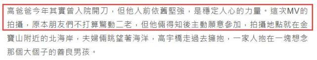这次MV中,高以翔的爸爸和妈妈也有参加。好友们原本不打算惊动二老,但两位老人家想要儿子能够安心,自动加入。而拍摄地方也距离高以翔墓地不远的北海岸,夫妇二人眺望海洋,儿子高宇桥从背后搂着二老,一家人在一路想念他。
