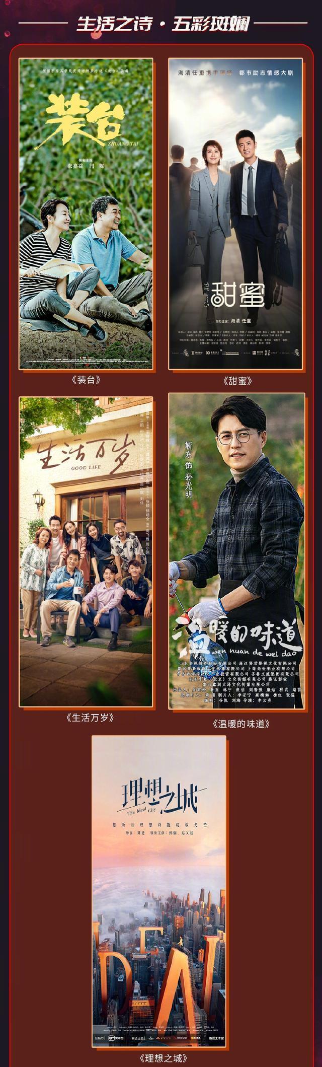 张嘉益、闫妮领衔主演的《装台》;任重、海清领衔主演的《甜蜜》;王鸥领衔主演的《生活万岁》;靳东领衔主演的《温暖的味道》;黄晓明领衔主演的《危机先生》;倪妮、刘诗诗、陈道明领衔主演的《流金岁月》;孙俪领衔主演的《理想之城》……