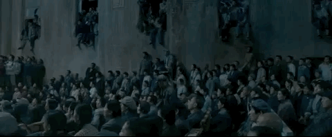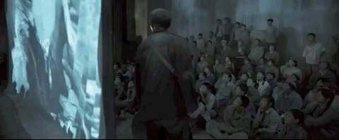 礼堂里上上下下挤满人,坐地上,骑窗户上,站墙角里,甚至连银幕后边,一个空位不剩。