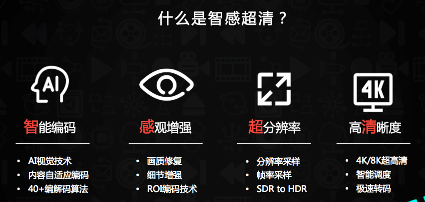 “智感超清”是智能编码、感官增强、超分辨率和高清晰度这四项技术的简称。它们面向视频处理领域,从技术发展的角度,代表了视频时代人们对美好事物的无限追求。