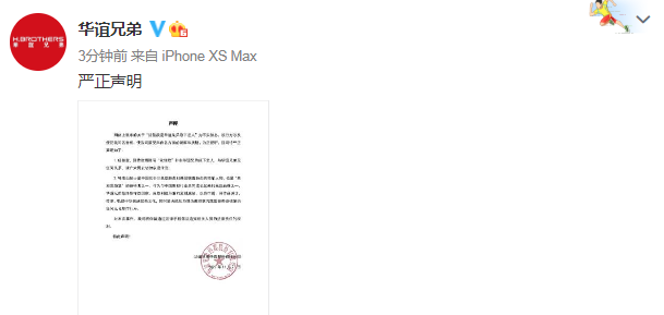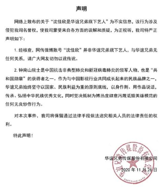 11月28日晚,华谊兄弟在社交平台发声明,否认沈佳欣是旗下艺人,并表示沈佳欣与华谊兄弟无任何干系。