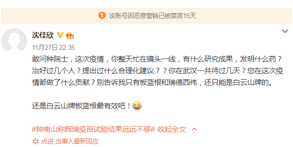 11月27日晚,网络用户沈佳欣在社交平台发言质疑钟南山院士,言语使人愤怒,目前该用户已因恶意营销被禁言15天。