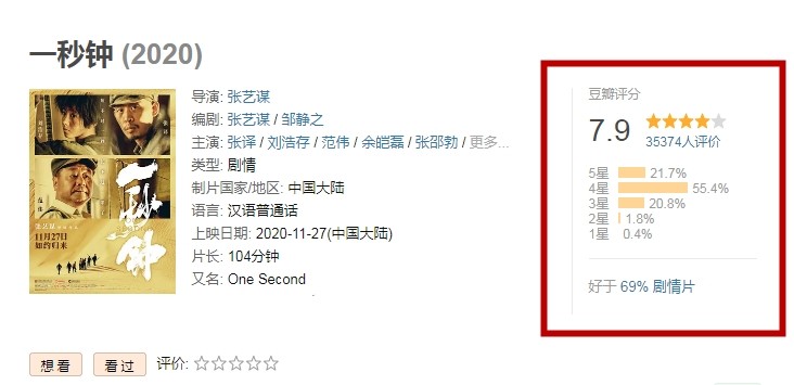 目前电影《一秒钟》才刚上映两天,电影票房更是突破了四千万,豆瓣评分更是高达7.9分,这个评分真是给该部影片打上了一个好口碑的标签。毕竟相比电影《除暴》的6.5分来说,电影《一秒钟》确实是在口碑方面遥遥领先了。