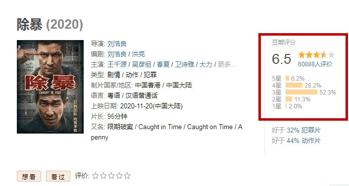 电影《除暴》从20号上映至今已经有9天时间了,目前《除暴》在豆瓣有6万多人参与了评分,虽然豆瓣评分不高也不低只有6.5分,但保持着一个不错的口碑。而该影片的票房成绩却很不错,在上映的9天时间里票房已经突破的3.5亿,这真是一个很不错的票房成绩。
