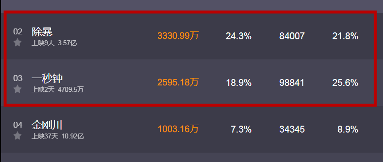不过电影《除暴》在票房成绩逐渐攀升的情况下,该影片也迎来了另一部票房“强敌”,那就是刚上映的电影《一秒钟》。