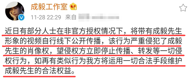 然后昨晚成毅的工作室就发布声明,称有部分人士在非官方的授权下,将带有成毅形象的视频在线下自行公开传播,要求他们立刻停止这种侵权行为,还警告他们再有这样的行为,会采用合法手段维权。