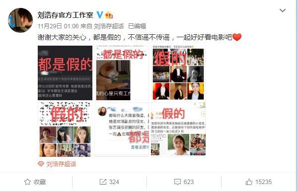 11月29日1时06分,刘浩存官方工作室的工作账号发文:谢谢大家的关心,都是假的,不信谣不传谣,一路好好看电影吧。并配上了各类造谣图片。