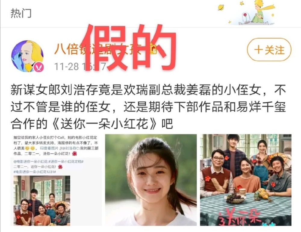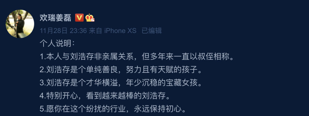 至于作为刘浩存“叔叔”的欢瑞副总裁姜磊则在11月28日晚就在社交平台发文进行辟谣,他说他和刘浩存不存在支属关系,但是多年来一向以叔侄相称。