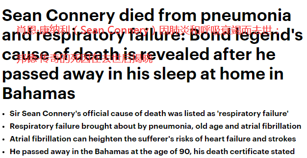 据报道,当时肖恩·康纳利患有“呼吸衰竭”,康纳利的呼吸衰竭是由肺炎、老年和心房颤动引起的,心房颤动是一种导致心率不规则和快速的心脏病,房颤反过来会增加患者心力衰竭和中风的风险。