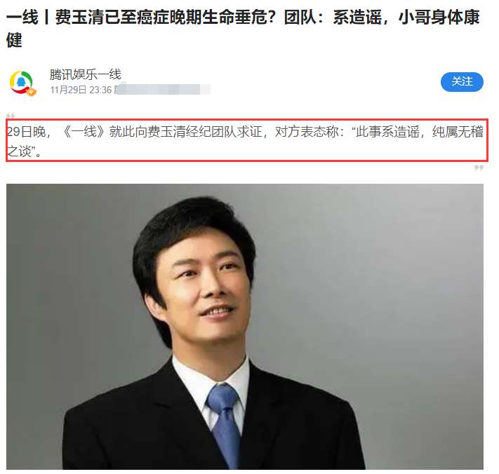 11月29日晚腾讯新闻《一线》联系到费玉清的工作职员,对方表态“此事系造谣,纯属流言蜚语”,辟谣患癌传闻。