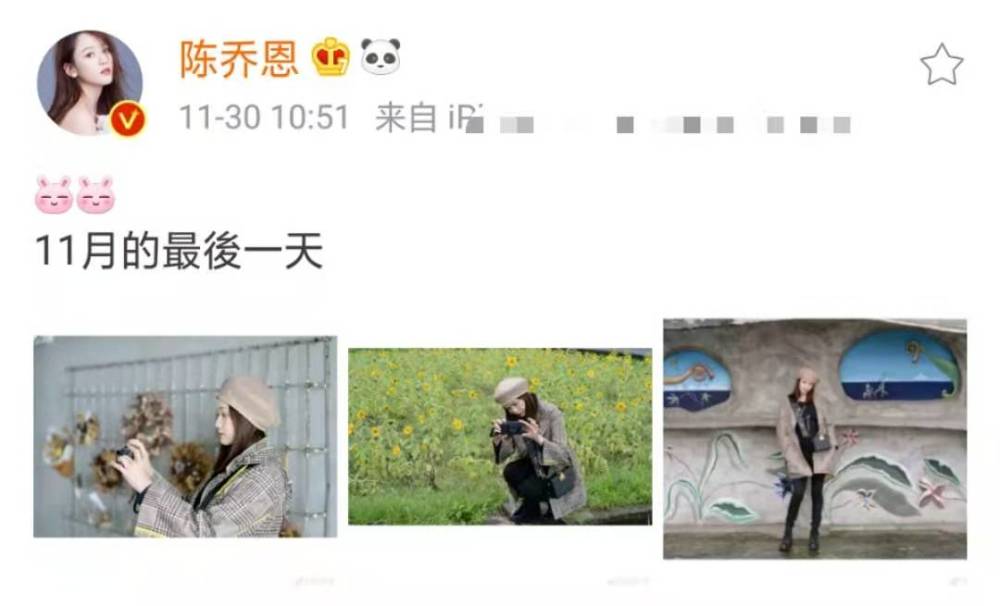 11月30日,陈乔恩继续发糖,她在小我社交平台上分享了一组男友视角出游美照,并附上了几个可爱的粉兔子表情,好心情尽显。虽然艾伦全程都没有出镜,但从陈乔恩的表现来看,拍照的八九不离十都是男友哦。