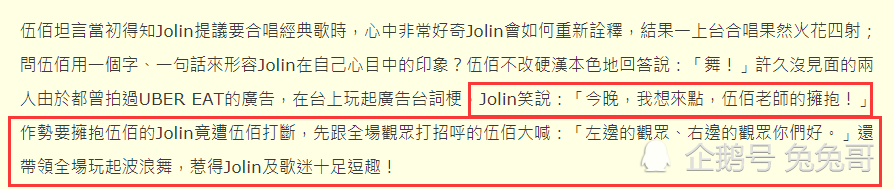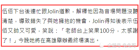 其中蔡依林在台上还直接表示“今晚我想来点伍佰老师的拥抱”,以后就准备拥抱伍佰,但没想到伍佰却未理会蔡依林,直接跟观众打起了招呼。