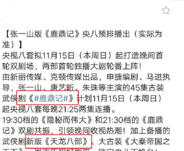 看到新《鹿鼎记》扑街,新《天龙八部》不由得了,开始捋臂张拳起来。近日多了不少新天龙即将播出的消息,不知是否在试探观众对新《天龙八部》的看法。有消息称该剧2020年底在央视八套播出,接档新《鹿鼎记》。