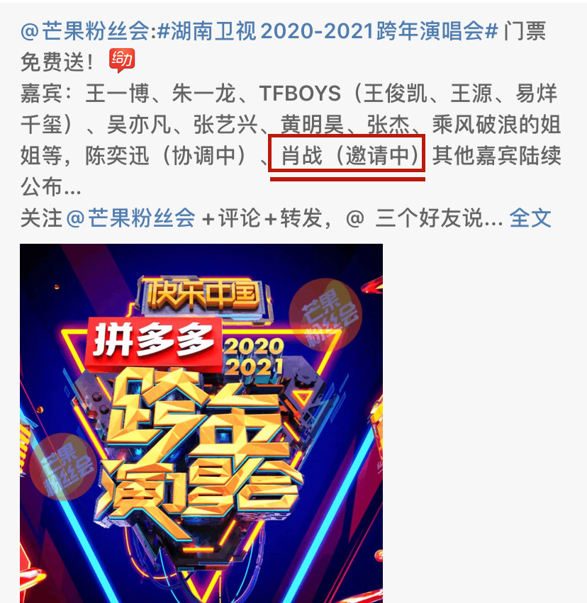 在网络上疯传的最多的就是:肖战的名字也出现在被括弧的“拟邀中”的嘉宾名单里面,其他嘉宾陆续公布。这是由“芒果粉丝会”发布出来的粉丝互动,以送票为福利,引来不少人的关注,光看这些有限宣布的嘉宾名单已经足够让粉丝沸腾了,这简直是要把圈中人气代表全部齐聚一堂,这让其他卫视的晚会怎么过。