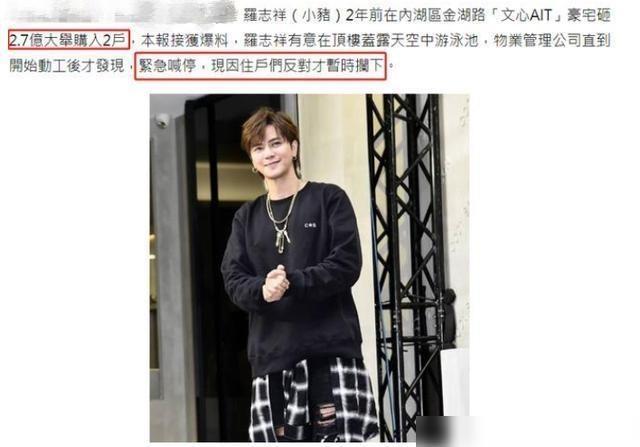 据悉,罗志祥原本打算在内湖的某处豪宅楼顶上,改造一个高空的露天泳池,已经开始动工了,但是引起了同楼邻居的不满,对方还向物业和相关部门进行投诉,工作闹大后,工程只得暂停,但是罗志祥声称自己已经得到了楼下住户的同意。