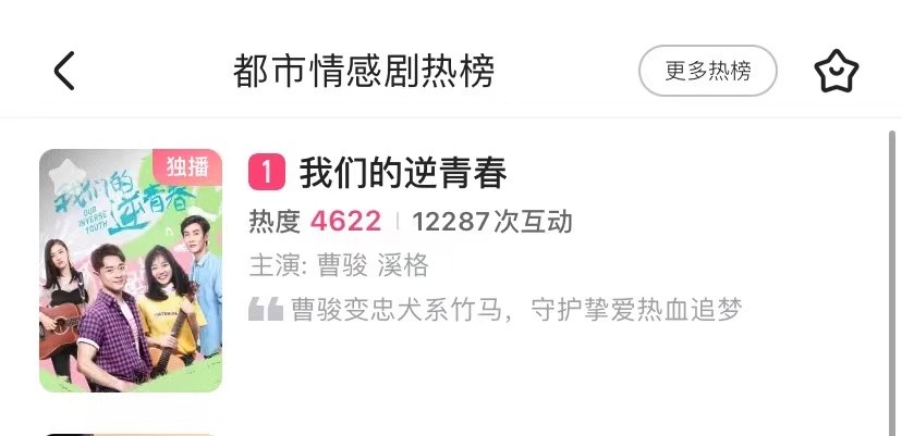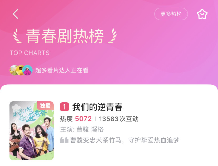 是否是感觉还不错?至少本小编是追的津津有味,十分火烧眉毛地期待着每周三到周六的更新!好了不说了,午时12:00优酷《我们的逆青春》我冲了,大家弹幕区见!