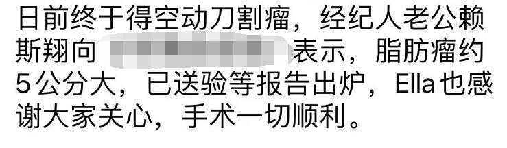老公赖斯翔受访时也透露,脂肪瘤有点难缠,在移除的时候,医生花了很长时间处理,好在过程还比较顺利。
