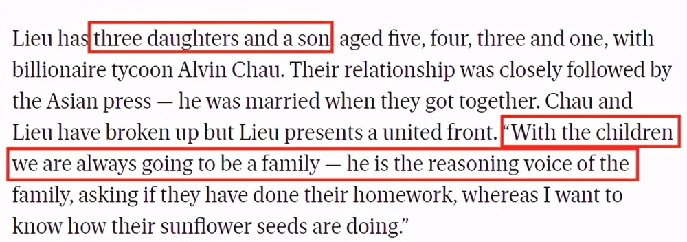 在12月2号,港媒爆出Mandy近日最新的一段采访内容,包括当中提到的家庭孩子,还提到了男友洗米华;而翻译过来的大致意思就是:和孩子们在一路,我们永远是一家于人,他(暗指洗米华)是孩子们的父亲。众所周知,Mandy跟洗米华在一路这些年,也是为男方生下了几个孩子;可据之前媒体报道,Mandy为洗米华似乎只生下3个孩子,可Mandy却透露自己是有4个孩子,而非港媒所说的三个,分别是三女一男;还表示几个孩子的生父就是亿万富豪洗米华。