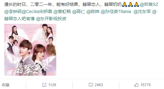 这几天,《翡翠恋人》的制片人发文引起了无数网友关注,《翡翠恋人》也许将定档于2021年。广大粉丝看到了这条消息自然是欢呼雀跃,所以让我们一路期待一下《翡翠恋人》的播出吧!