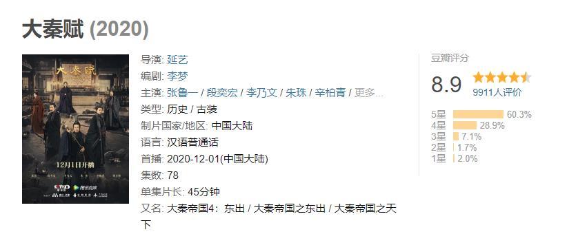 《大秦赋》原名为《大秦帝国之天下》,虽经历了改名但依旧不负所望,开播仅3天,评分就达到了8.9分,毫不夸张说,这一系列是国产剧豆瓣评分最高的一个系列。