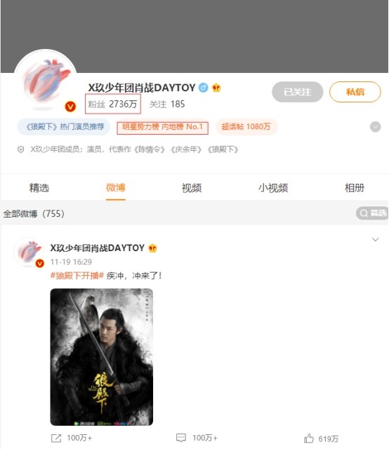 这固然说明肖战的流量大,但更为具体的体现,则是肖战粉丝的不懈支持。