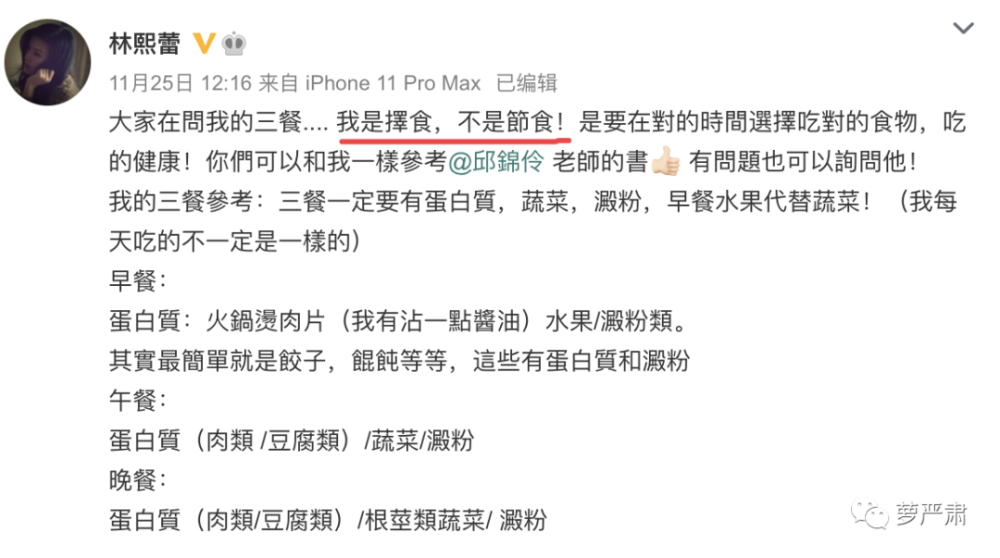 在节目里,她还重点讲解了自己的独家食谱,什么时候该吃什么分析到位,下节目又在微博里分享了出来,还嘱咐大家要注意,是“择食”不是“节食”,必然要健康生活不要盲目饿到自己。