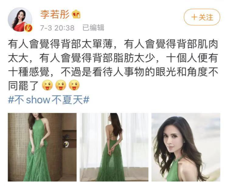 女明星也会承受更多人们以“喜爱”为名的“裹挟”,李若彤早就发现了这一点,身为一个经典的被架在神坛上的“女神”,她不出来,人们惋惜看不见她,她一出来,又有人说美人迟暮。也许那些人想要的是永远停留在1998年李若彤,如果被这样的期待值束缚住,李若彤永远不行快乐。