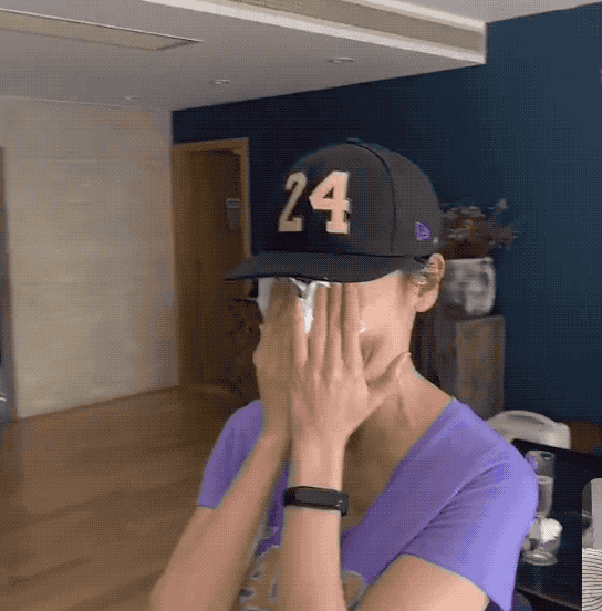 她还是热血篮球迷,戴着科比的24号周边帽子,看着湖人的比赛会看到流泪。