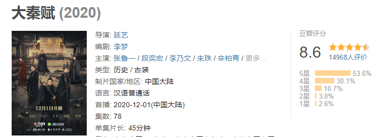 然而,开播第四天,《大秦赋》的口碑便逐渐松动,豆瓣目前已跌至8.6分,并且仍有降落的趋势。